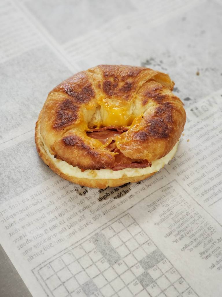 Choice of Protein (Bacon, Sausage, Ham or Turkey), Fried Egg, Cheddar Cheese toasted in a Croissant