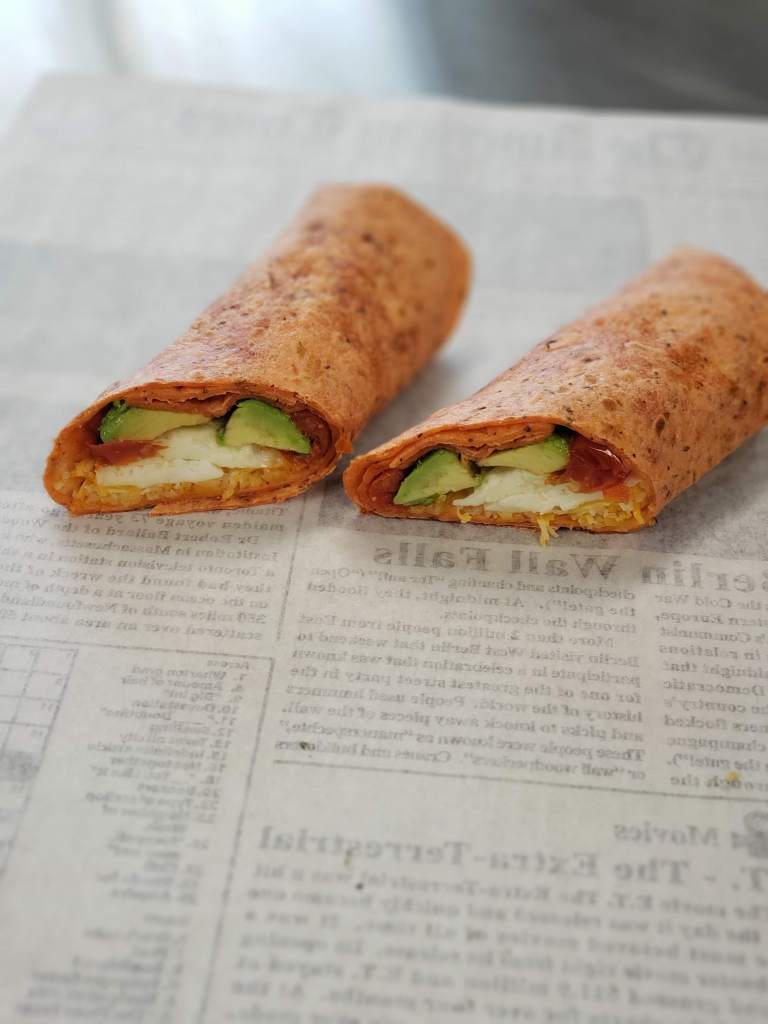 Fried Egg, Avocado, Roasted Tomatoes, Shredded Monterey Jack Cheese toasted in a Tomato Basil Wrap