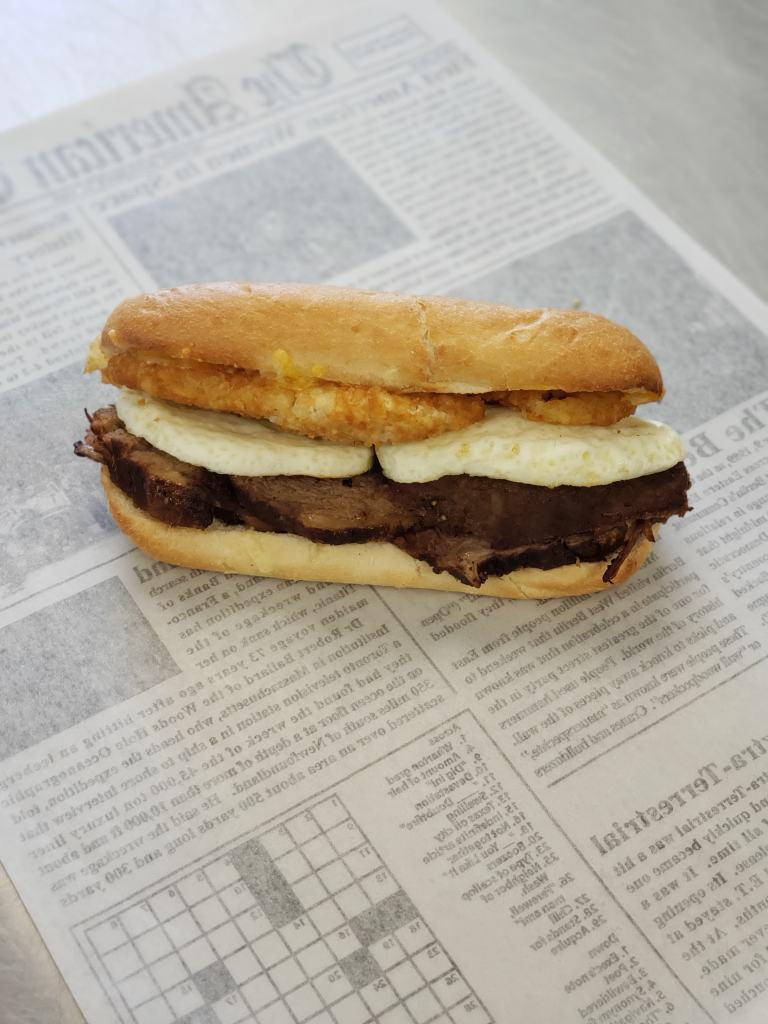 The Workin’ Man’s Sandwich!!! Roast Beef, Fried Egg, Hash Brown, Shredded Monterey Jack Cheese toasted in a Hoagie