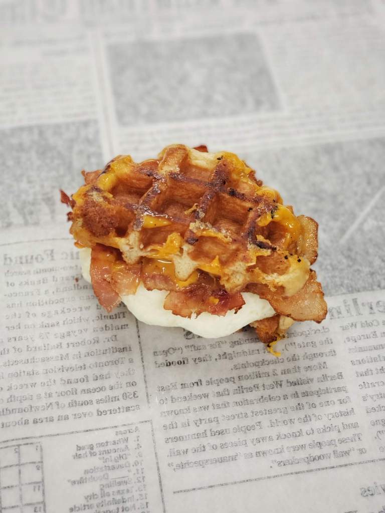 Choice of Protein (Bacon, Sausage, Ham or Turkey), Fried Egg, Cheddar Cheese toasted in a Pearl Sugar Belgium Waffle