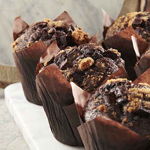 Our double chocolate muffin has premium, semi-sweet Belgian chocolate chips and finished with cinnamon streusel and chocolate chunks.