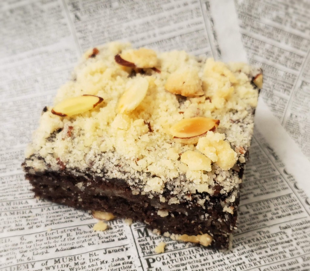 Almond filling between two moist chocolate cake layers and topped with almond streusel