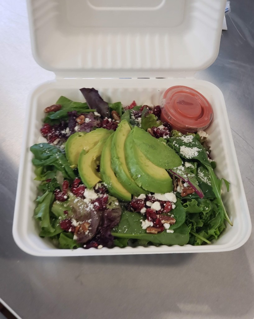 Avocado, Cranberries, Toasted Pecans, Feta Cheese, Raspberry Vinaigrette, Club Crackers on a bed of Lettuce Mix
