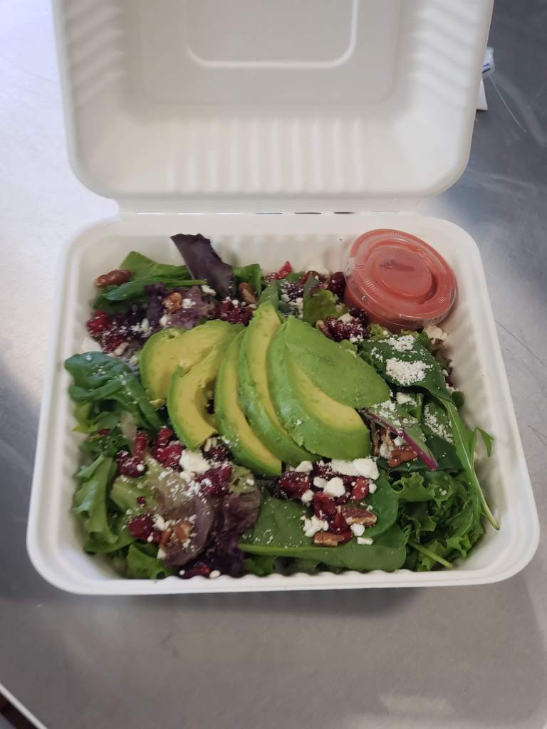 Avocado, Cranberries, Toasted Pecans, Feta Cheese on a bed of Mixed Greens